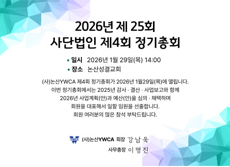 사단법인 논산YWCA 사단법인 제4회 정기총회(제25회)를 개최합니다.